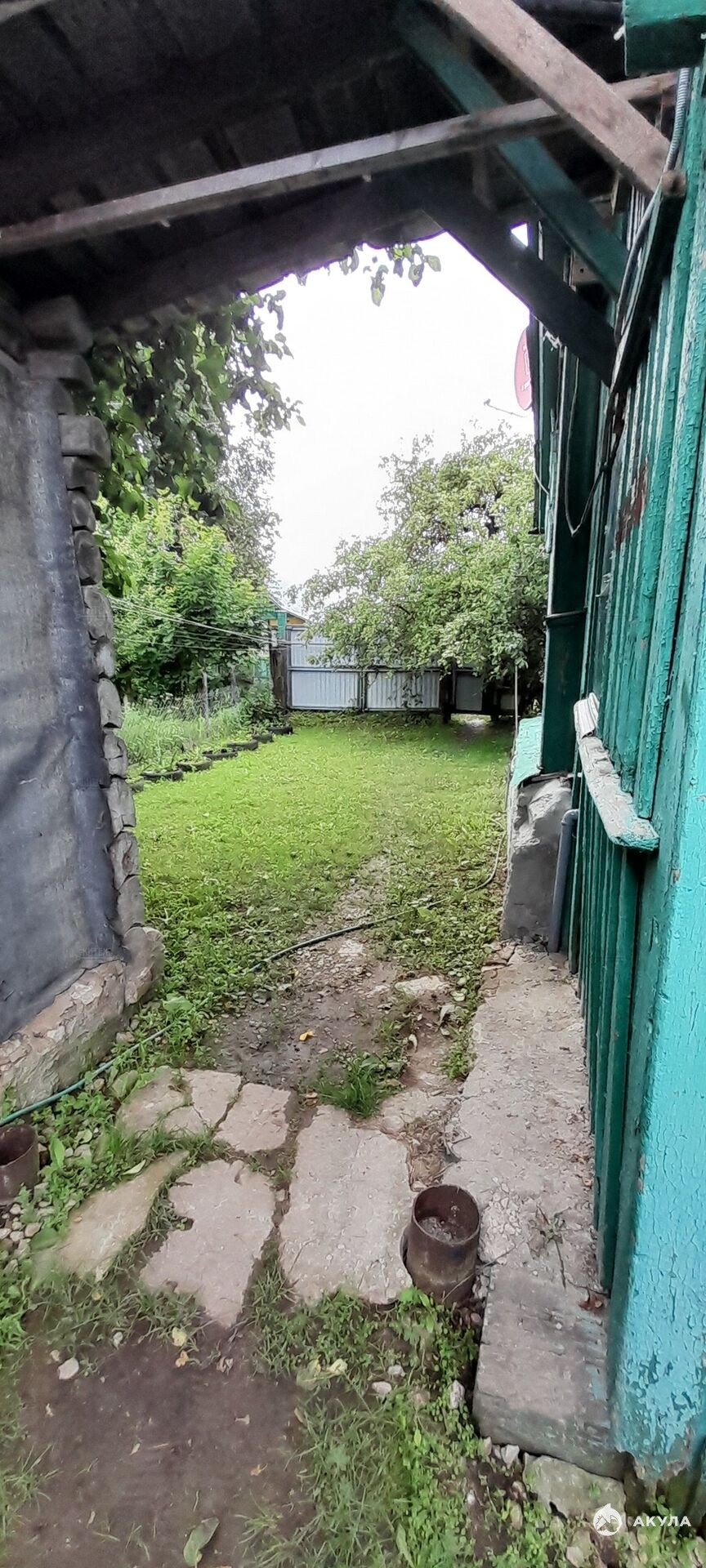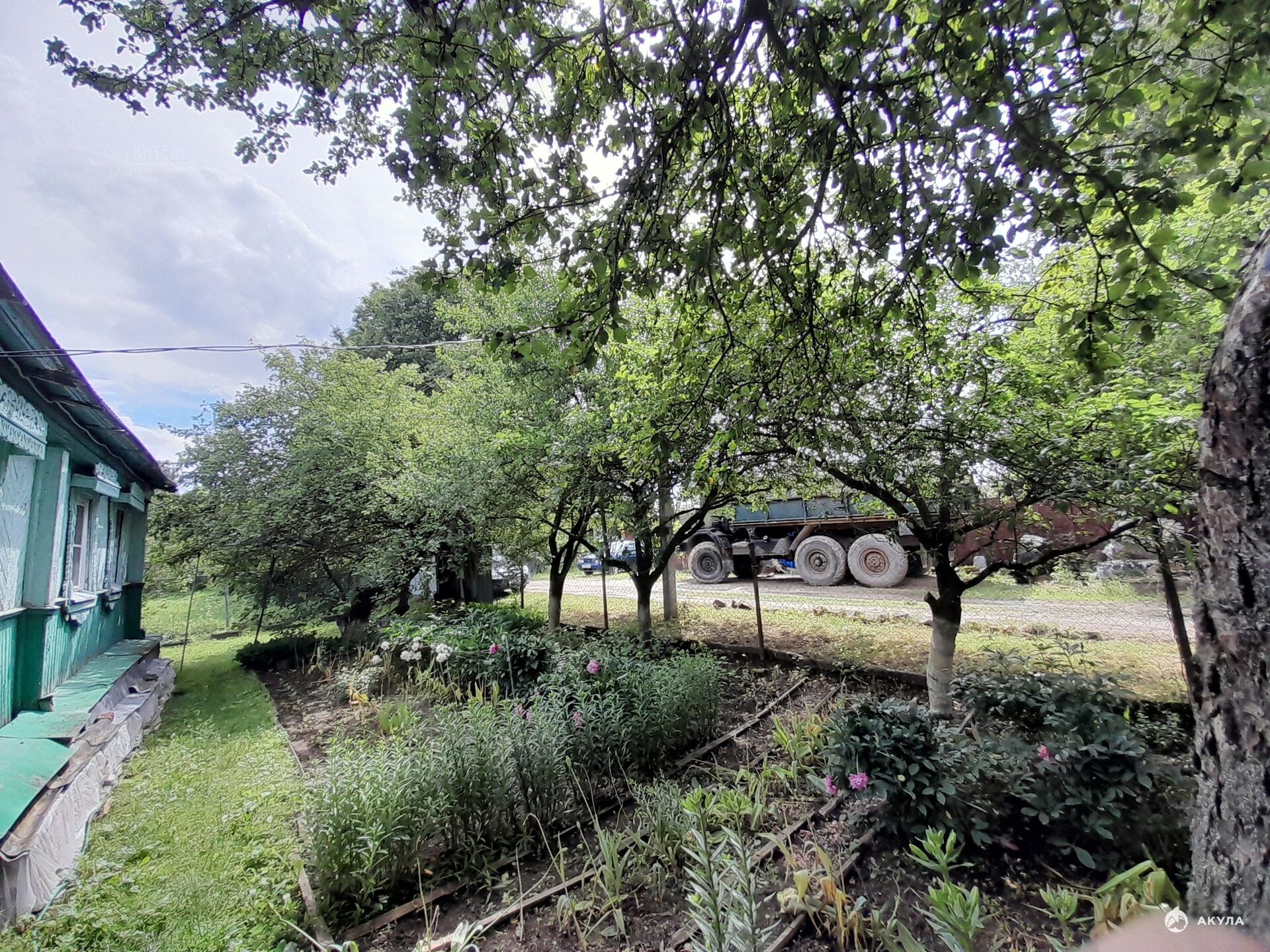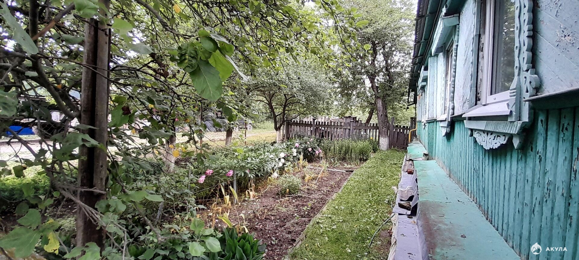 Участок почти квадратный, ухоженный, с садовыми посадками, плодовыми деревьями и цветами.