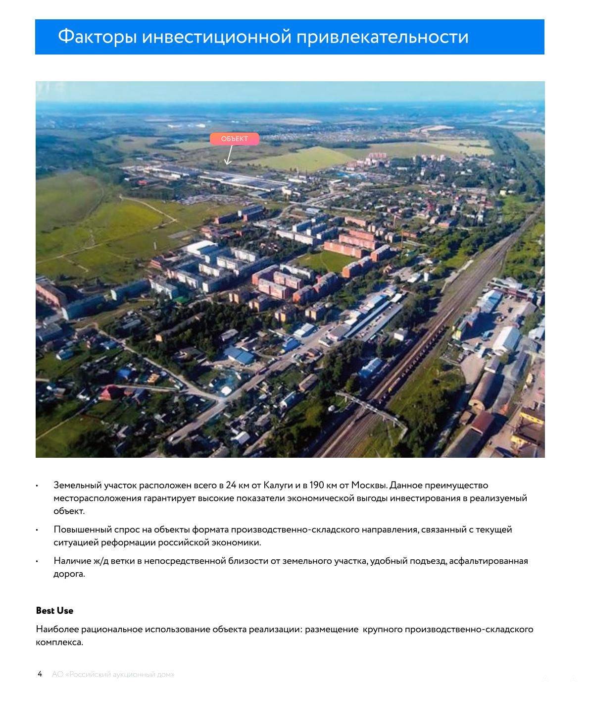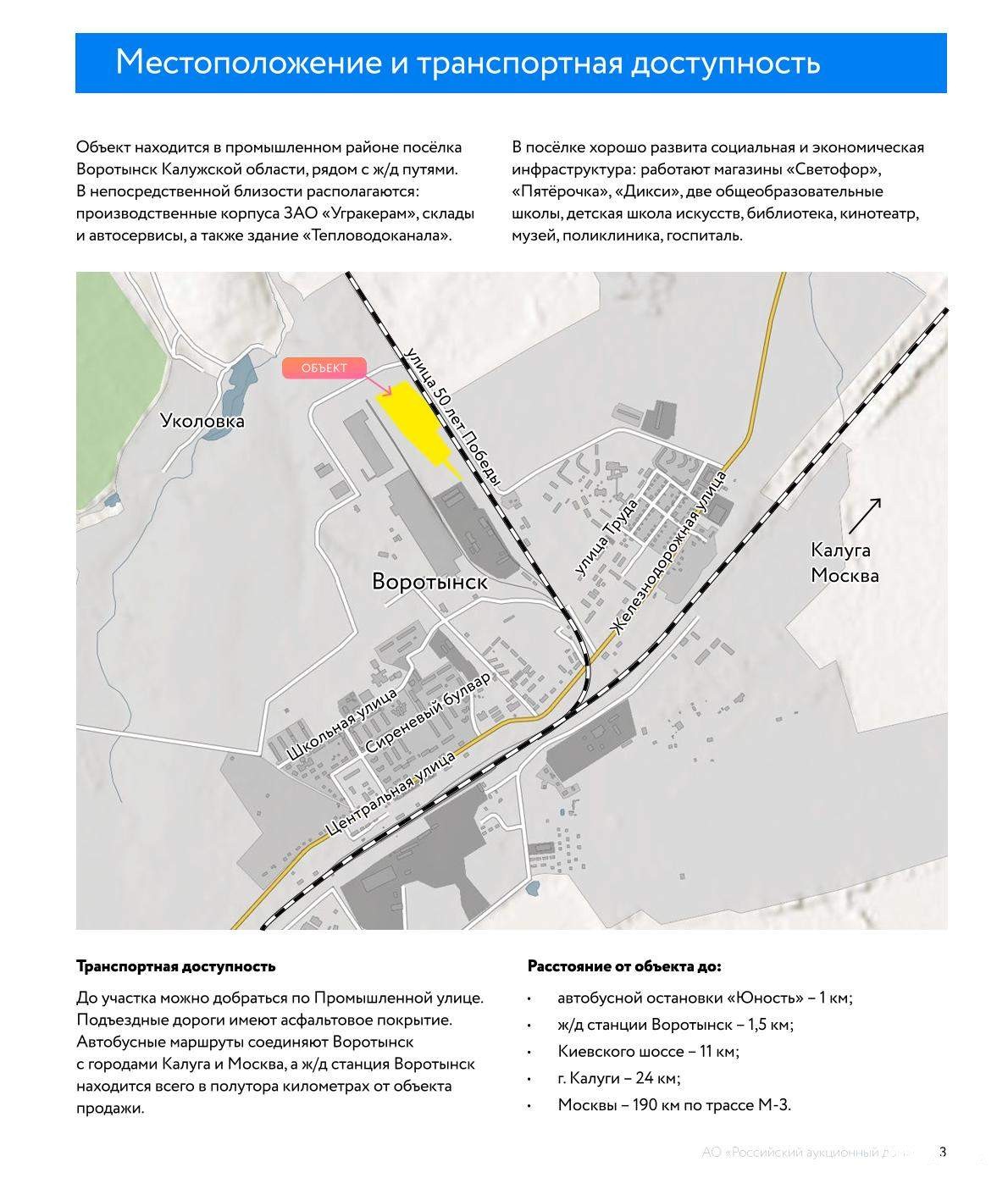 В рамках реализации имущества ПАО "Центр по перевозке грузов в контейнерах "ТрансКонтейнер" с торгов продается: Земельный участок 5, 6 Га. Адрес ориентира: Калужская область, р-н. Бабынинский, п. Воротынск, ул. Промышленная, д. 19. Общая площадь: 56 497 +/- 83 кв. м Кадастровый номер: 40: 01: 030413: 12 Категория земель: Земли населенных пунктов Вид разрешенного использования: для производственной деятельности Обременения (ограничения) права: - ограничение прав на земельный участок, предусмотренные ст. 56, 56.1 Земельного кодекса РФ: охранная зона инженерных коммуникаций; - ограничение прав на земельный участок, предусмотренные ст. 56, 56.1 Земельного кодекса РФ: охранная зона инженерных коммуникаций; - ограничение прав на земельный участок, предусмотренные ст. 56, 56.1 Земельного кодекса РФ: санитарно-защитная зона предприятий, сооружений и иных объектов. Месторасположение и окружение: Объект находится в промышленном районе посёлка Воротынск Калужской области, рядом с ж/д путями. В непосредственной близости располагаются: производственные корпуса ЗАО «Угракерам», склады и автосервисы, а также здание «Тепловодоканала». В посёлке хорошо развита социальная и экономическая инфраструктура: работают магазины «Светофор», «Пятёрочка», «Дикси», две общеобразовательные школы, детская школа искусств, библиотека, кинотеатр, музей, поликлиника, госпиталь. Транспортная доступность: До З/У можно добраться по Промышленной улице. Подъездные дороги имеют асфальтовое покрытие. Автобусные маршруты соединяют Воротынск с Калугой и Москвой, а ж/д станция Воротынск находится всего в полутора километрах от объекта продажи. Расстояние от Объекта до: автобусной остановки «Юность» 1 км; ж/д станции Воротынск 1, 5 км; Киевского шоссе 11 км; г. Калуги 24 км; ТТК 190 км по трассе М-3.