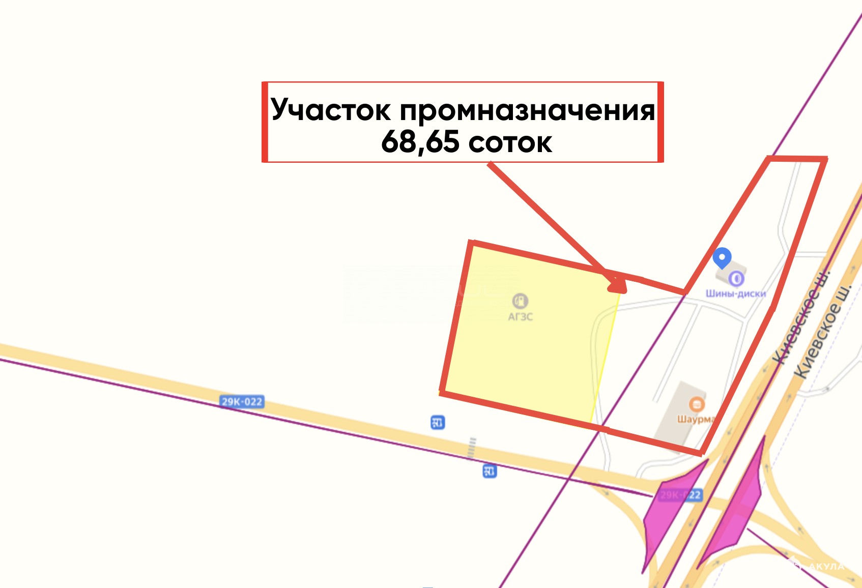 ✅ Участок находится на перекрестке двух трасс М3 (Киевское шоссе) и 29К-022, что обеспечивает высокий автомобильный трафик. Удобный и открытый съезд с трассы в 3 местах, что позволяет большегрузному транспорту съезжать и выезжать без разворотов.