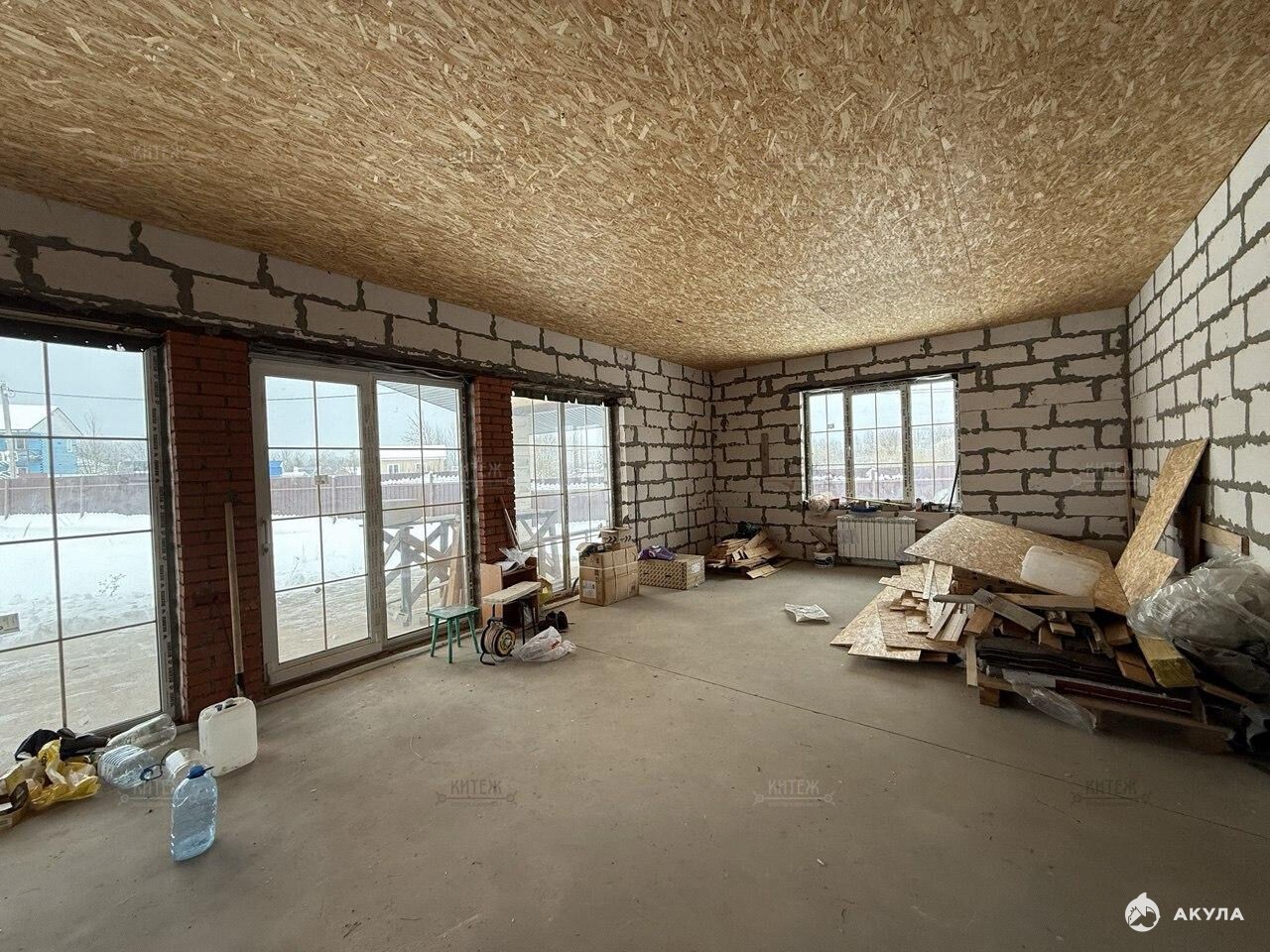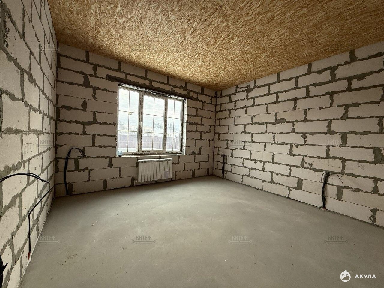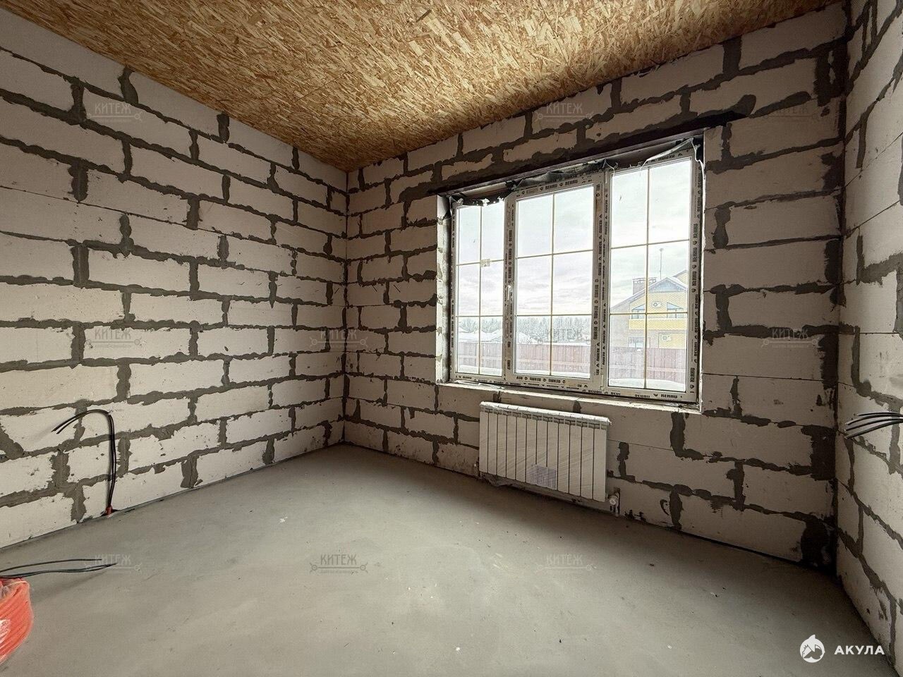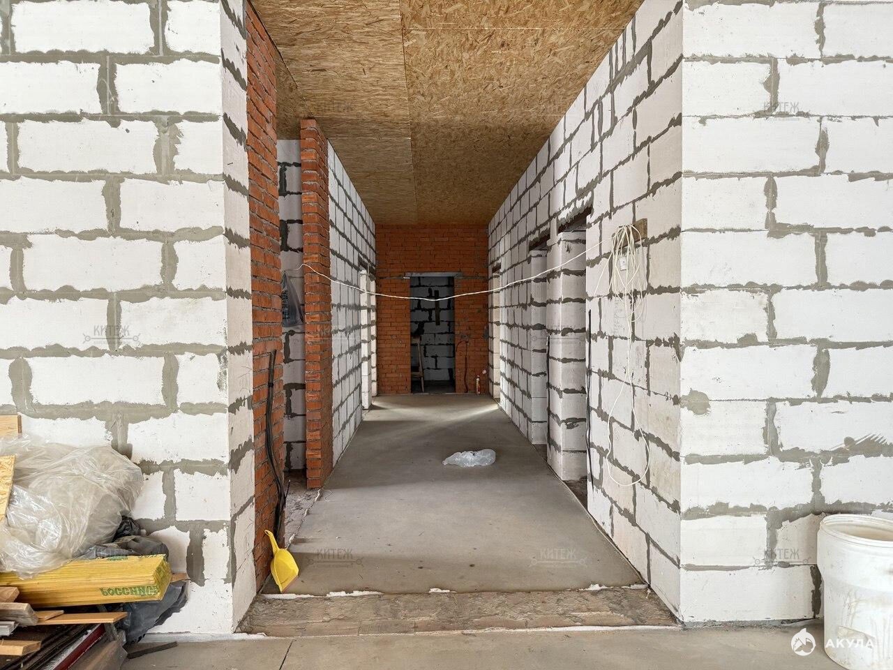 Фундамент - монолитная плита, материал наружних стен - газобетонный блок 400мм. Крыша подшита, оборудована водосточной системой. Проведено отопление, утановлены батареи, сделана разводка электрики.