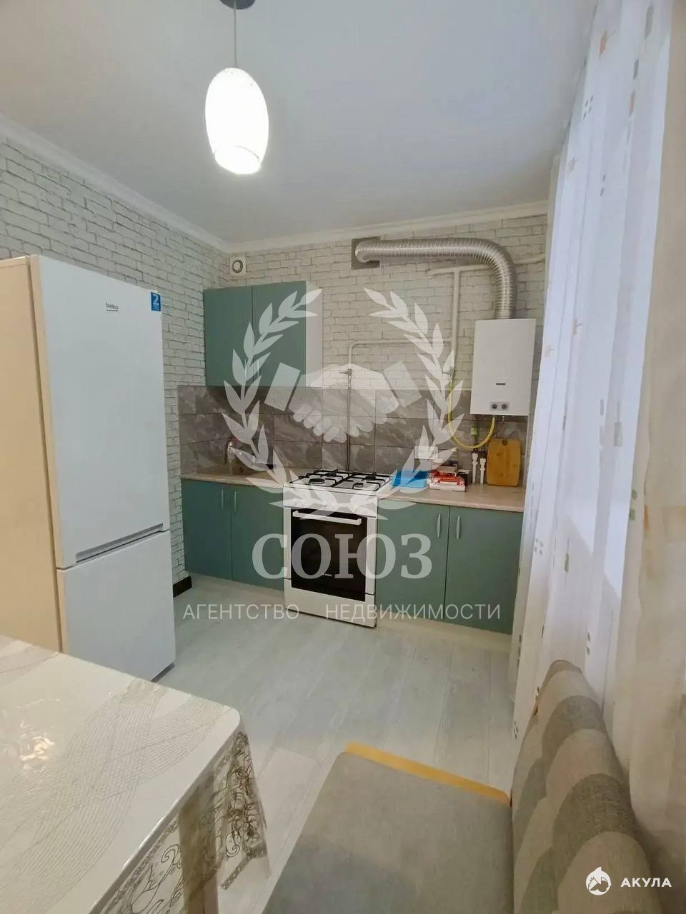Кухня полностью готова к заселению: установлена газовая плита и холодильник.