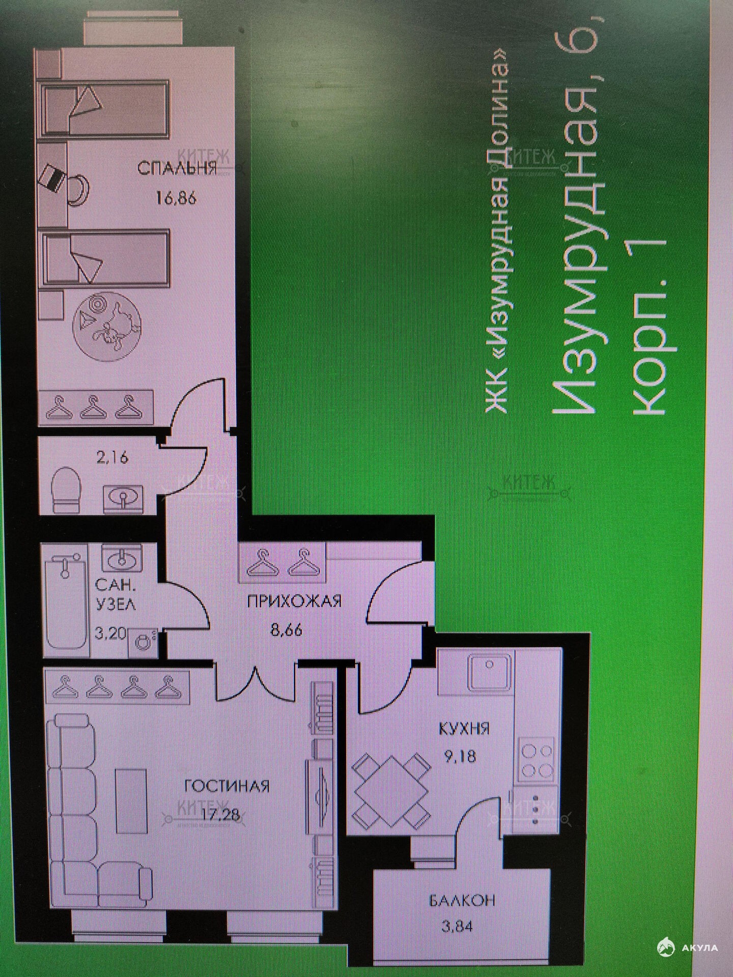 Общая площадь 59.5 , комнаты 17.28 и 16.86 выходят на разные стороны , кухня 9.18 , приличный раздельный сан/узел 3.96 , прихожая 8.66 , застекленная лоджия 3.84.