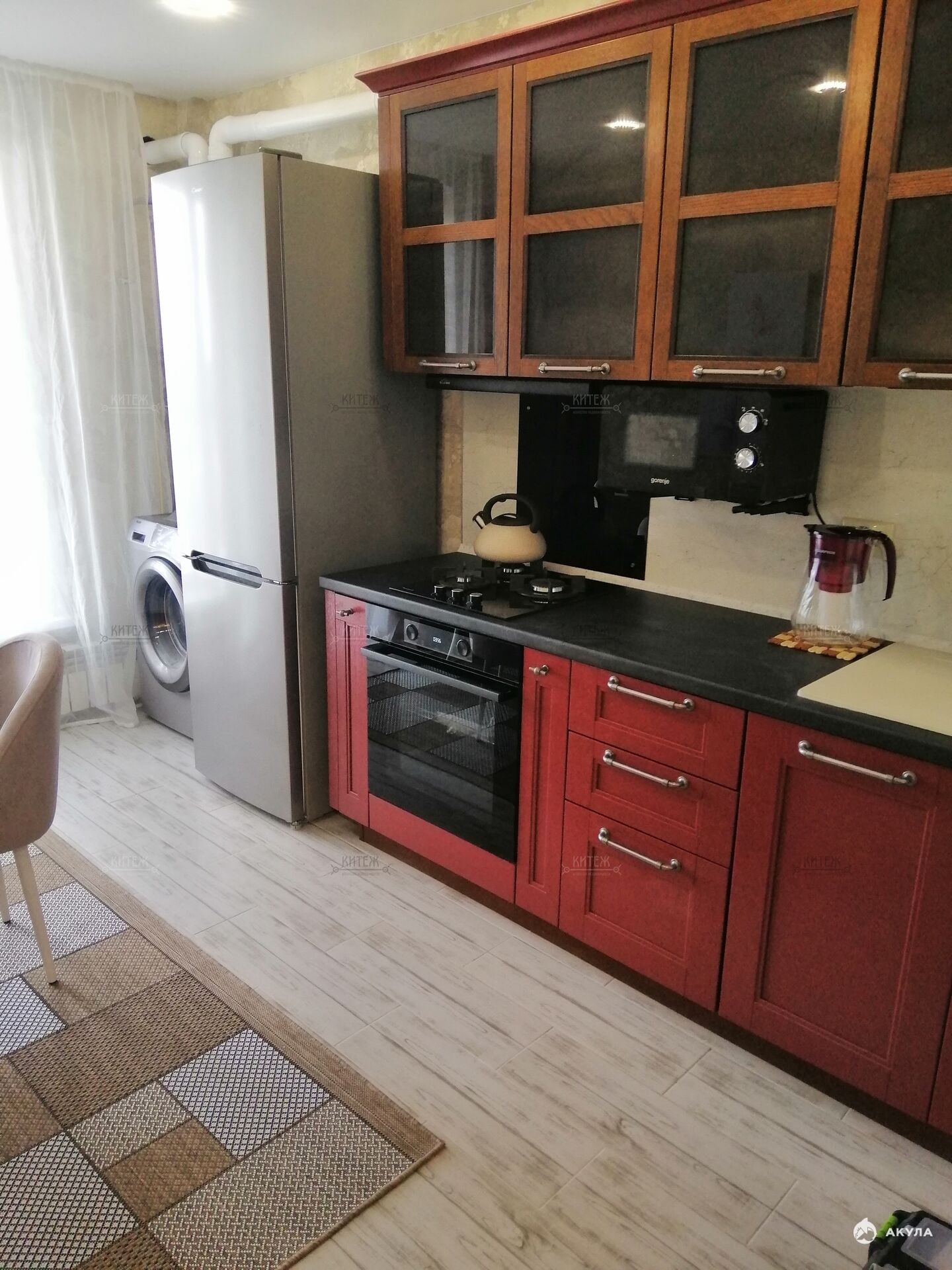 2-х спальная кровать с добротным ортопедическим матрасом, спальными принадлежностями , вместительный шкаф ..Кухонный гарнитур со всей встроенной техникой , посудой и столовыми приборами.